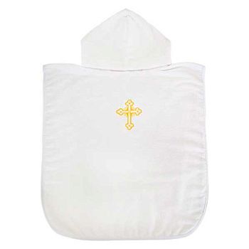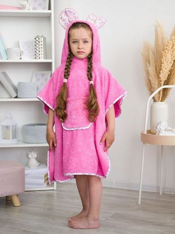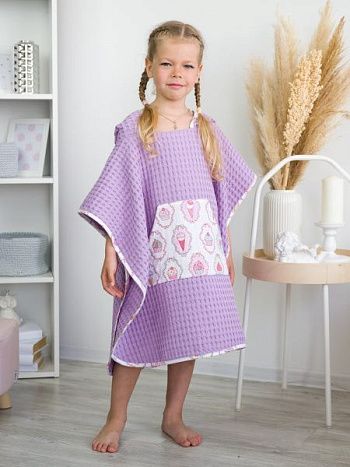 Пончо имеют стандартный размер 60 х 120 см. Накидка с капюшоном подходит для детей дошкольного возраста. Модели различаются разнообразной окраской, среди которых преобладают пастельные оттенки. Многие из них украшены нежной вышивкой. Основное предназначение пончо – накидывание на ребенка после купания. Одежда легко надевается через голову. Отсутствие застежек и завязок открывает простор для движений. Дети могут резвиться после купания, а капюшон защищает от сквозняков и переохлаждения.