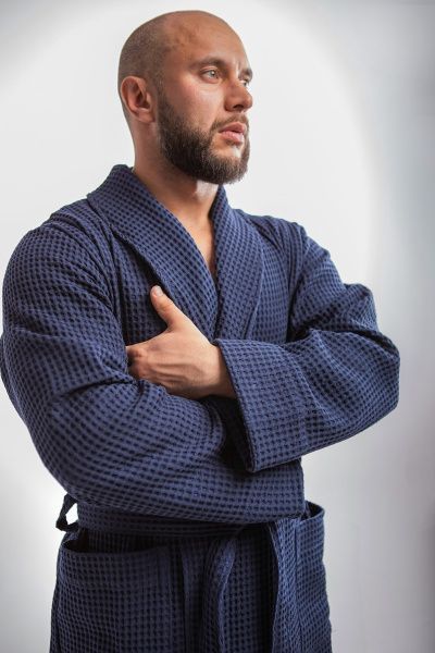 Халат вафельный с капюшоном, два цвета, темно-синий