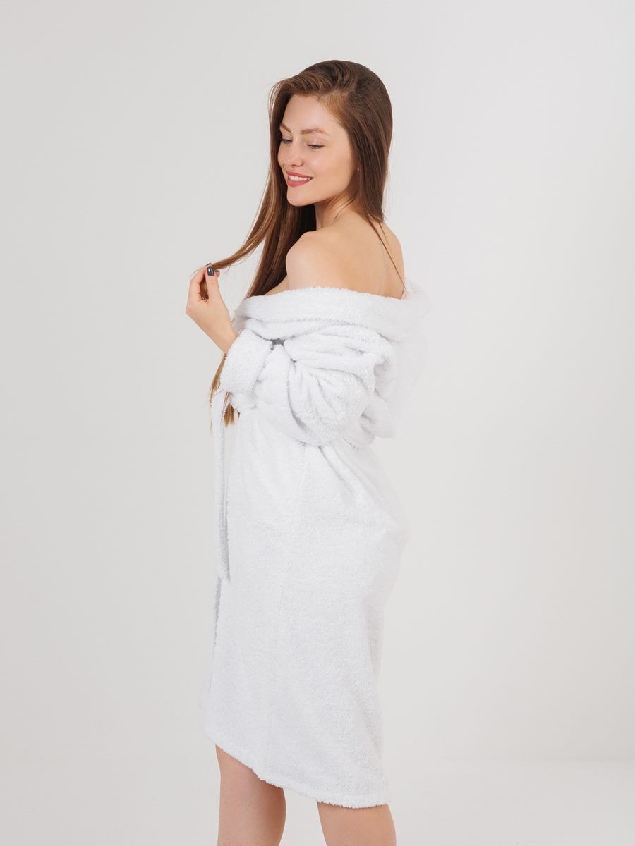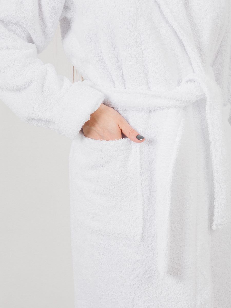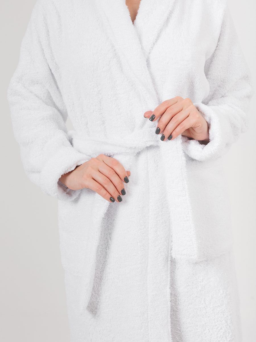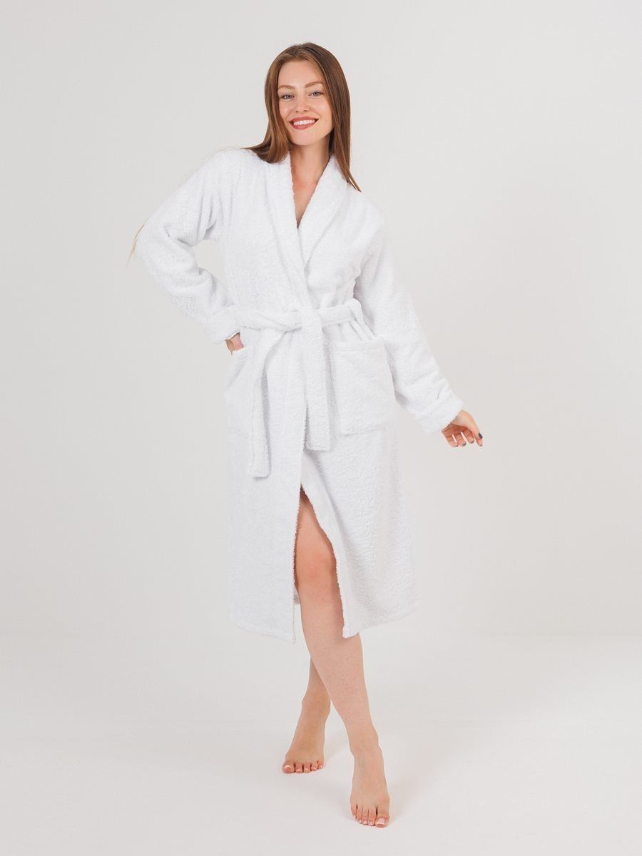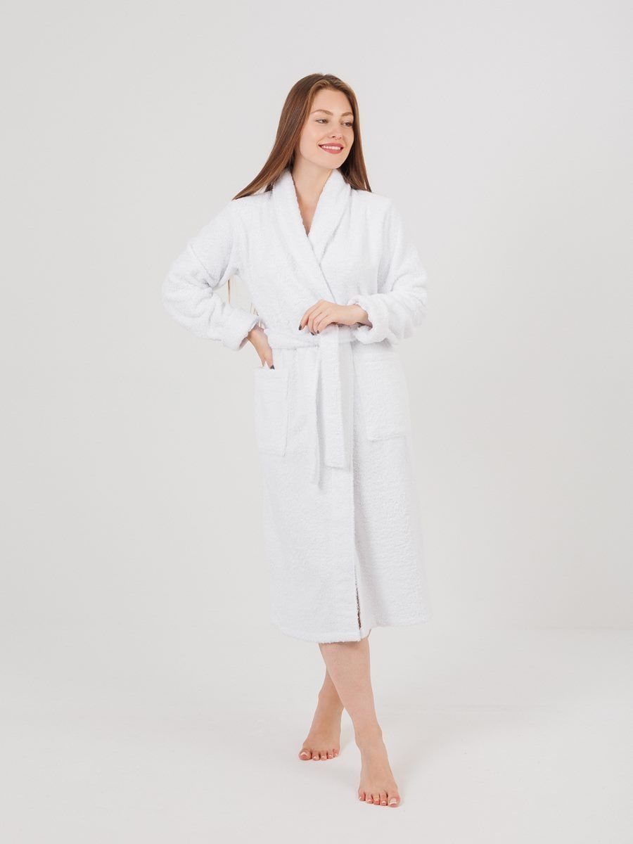 Женский белый махровый халат с воротником шалька,изготовлен из 100% хлопка, выращенного в экологически чистых регионах.