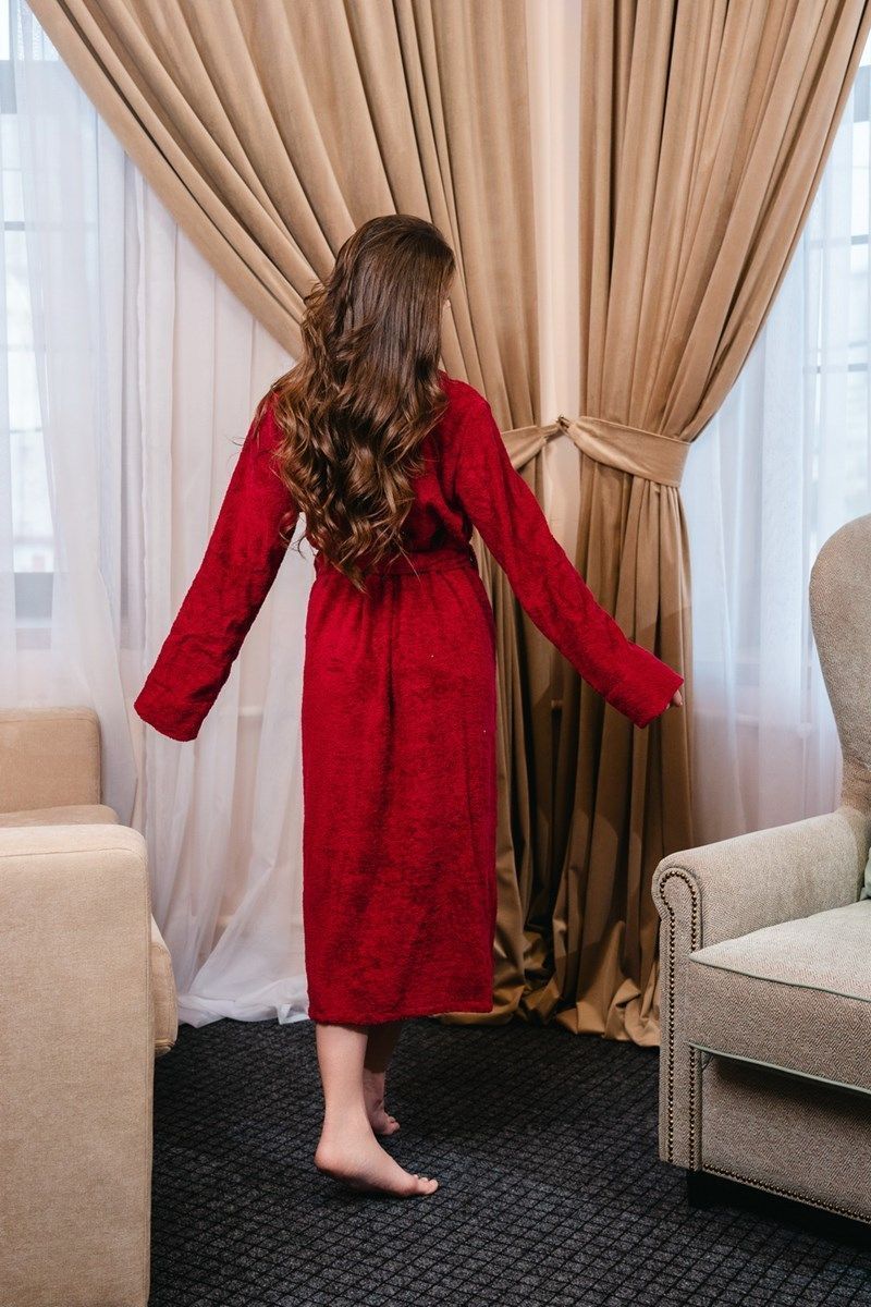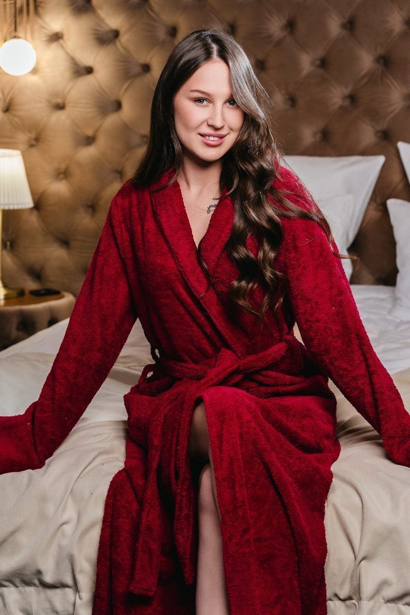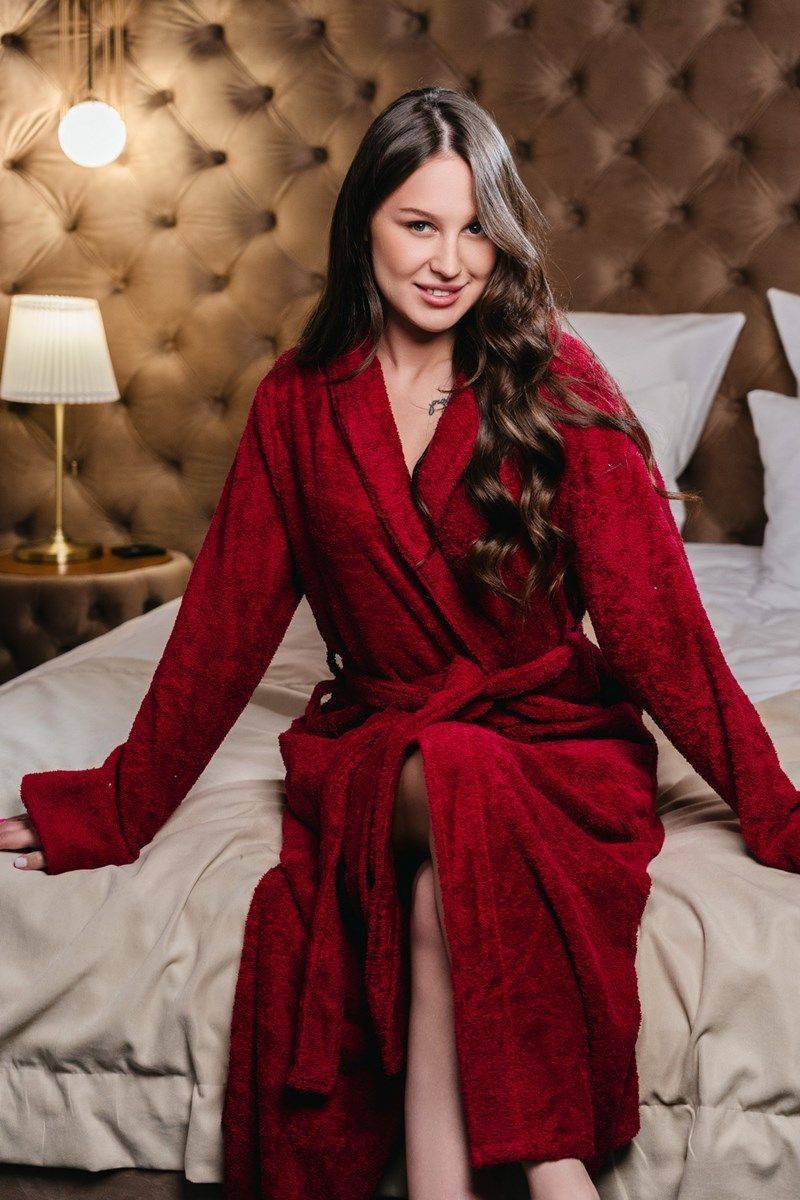 Женский бордовый махровый халат с воротником шалька,изготовлен из 100% хлопка, выращенного в экологически чистых регионах.