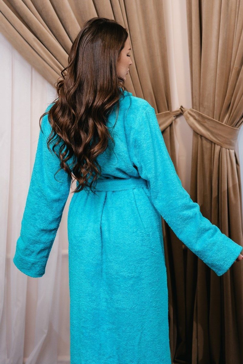 Женский голубой махровый халат с воротником шалька,изготовлен из 100% хлопка, выращенного в экологически чистых регионах.