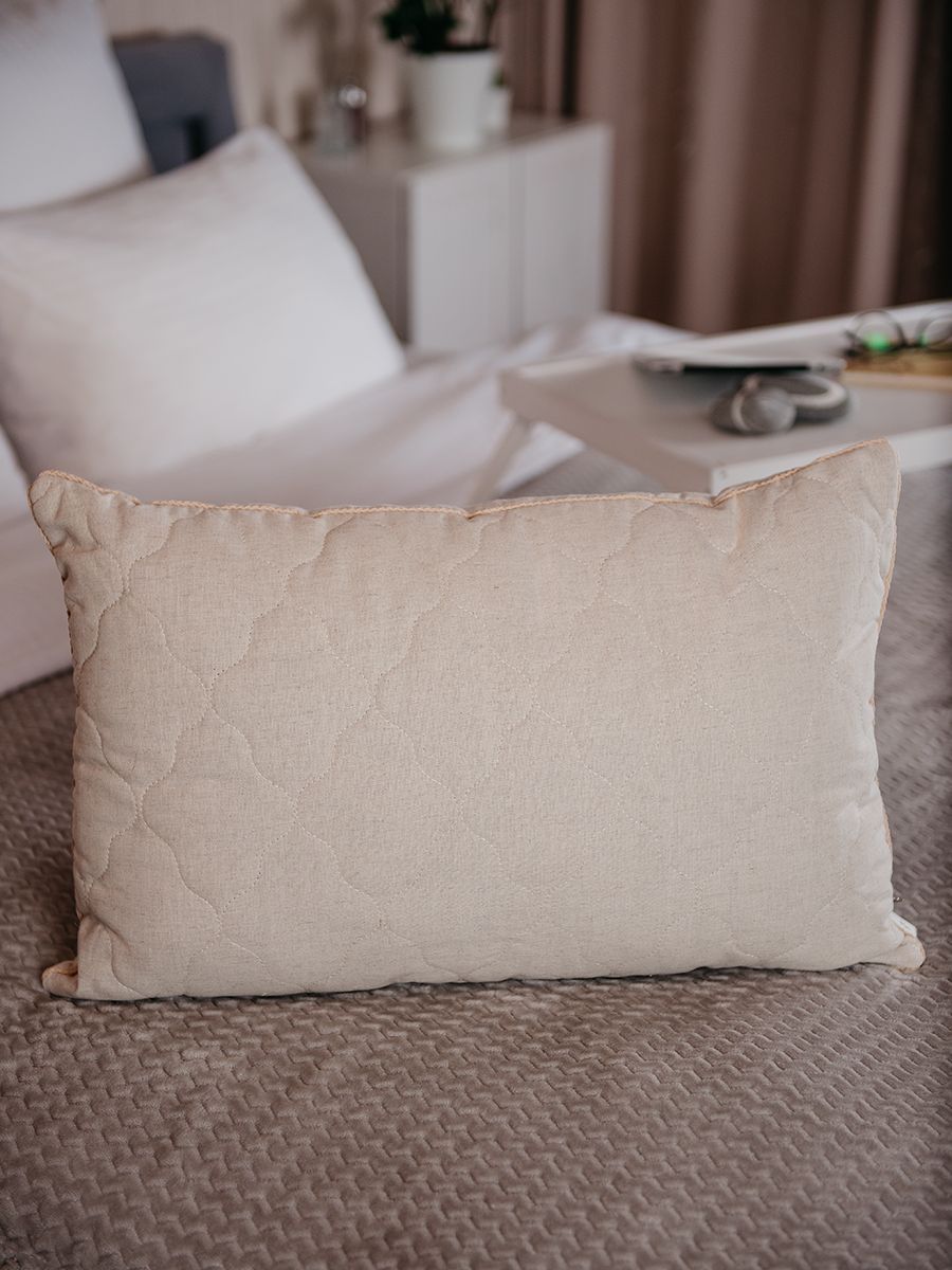 Льняной чехол подушки простеган верблюжьей шерстью, которая обладает хорошими разогревающими свойствами. Поэтому подушка очень теплая и целебная.