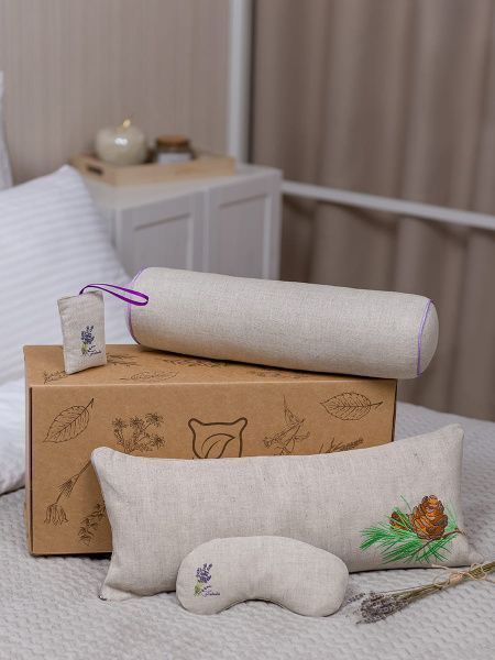 Потрясающий набор не только для здорового сна, но и для полноценного расслабления. Кедровая подушка под голову обеспечит ортопедическую поддержку шеи, а также окажет легкое массажное воздействие на кожу головы и лица во время сна. Удобный валик для расслабления мышц тела и подушечка на глаза медитация с чудным ароматом лаванды подарит приятную прохладу благодаря охлаждающим свойствам.