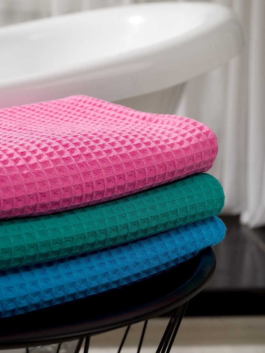 Полотенца изготовлены из вафельной ткани высокого качества с рельефным безворсовым плетением в виде крупной мягкой клетки. Эти полотенца намного толще и пышнее привычных вафельных полотенец.  Благодаря особому плетению и крупной клетке ткань получилась мягкой и очень воздушной. При соприкосновении с кожей она не вызывает раздражения или неприятных ощущений. Нежное как облачко, это полотенце идеально подойдет малышам и людям, которые ценят свой комфорт. Вафельное полотно произведено из 100% хлопка на современном  итальянском оборудовании в Республике Узбекистан. Оно обладает высокой прочностью и износостойкостью, что обеспечивает изделиям из него долгий срок службы и практичность в использовании. Даже после многократных стирок изделие не линяет, не деформируется и полностью сохраняет свои свойства.